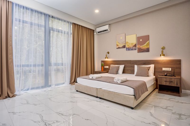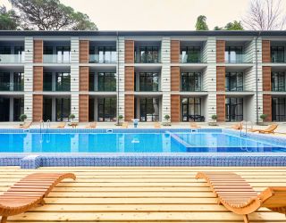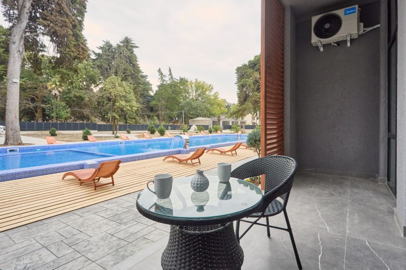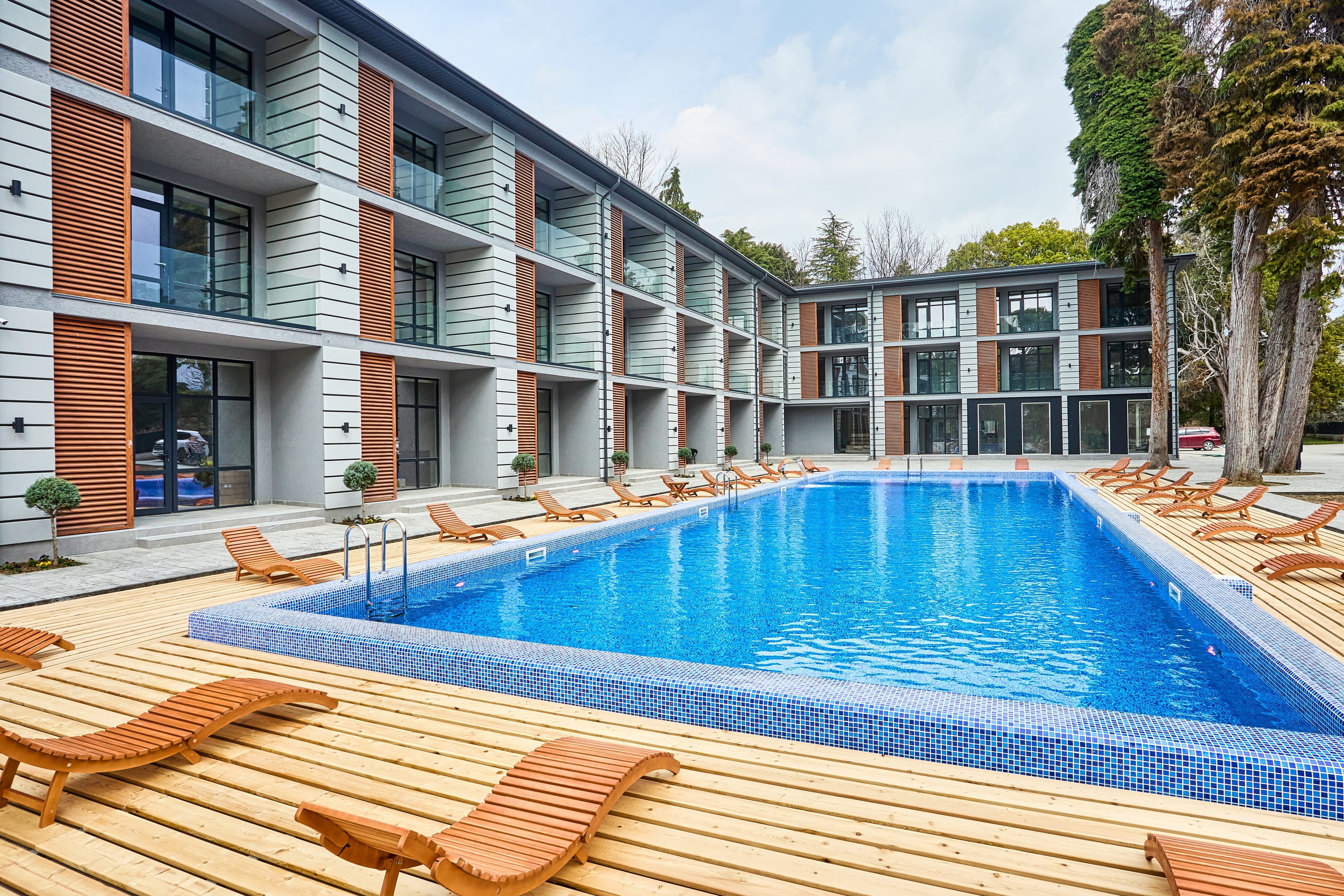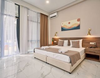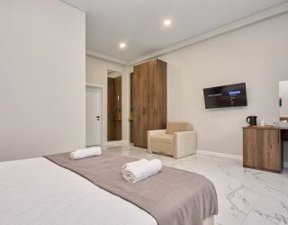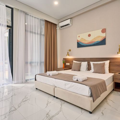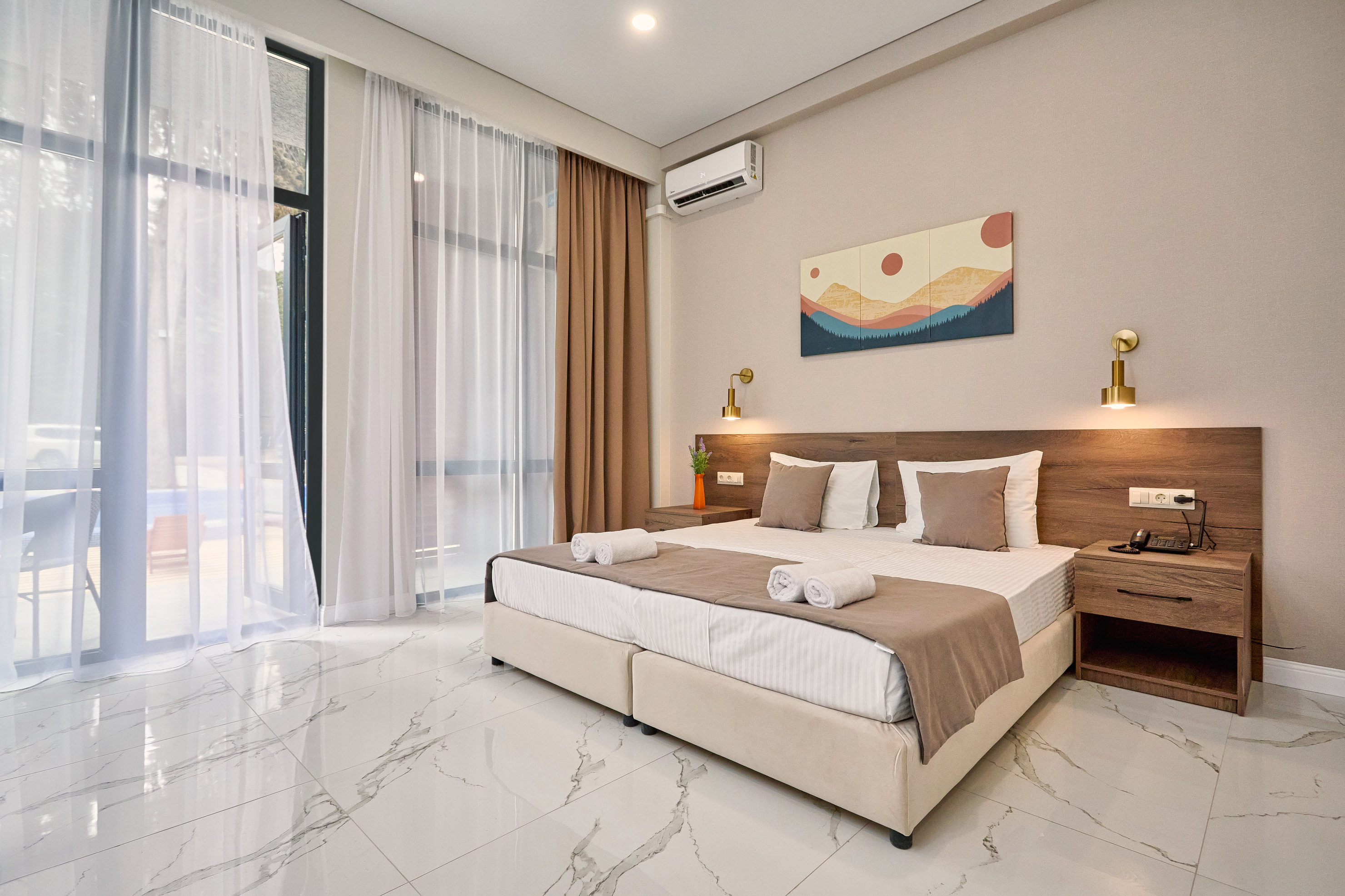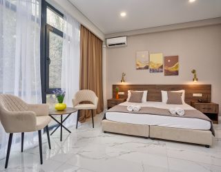 Просторные номера, оформленные в современном стиле с легкими нотками черноморского шарма, предлагают захватывающие и незабываемые впечатления. Панорамные окна позволяют наслаждаться парковой территорией отеля, нежась в мягких лучах солнца. Каждый номер оснащен всем необходимым для комфортного проживания.